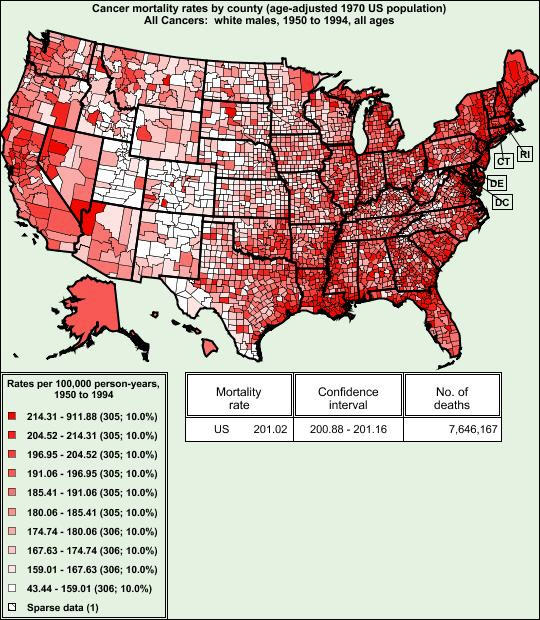 Here is a map of death by cancer, scaled by population for a 44 year period. There is some correlation with radioactivity, but it isn't huge. The Mississippi delta appears to be a worse source of cancer than naturally occurring radiation. Could some of the areas in the west where radiation abounds confer a protective effect on the population, providing "free" therapy? Maybe not. A region that refutes this is the south east corner of Nevada extending towards Southern California. Was there atomic testing there? Are there different isotopes present in the Las Vegas/Lake Mead/Kingman area? What is in Lake Mead? What is going on in the Mississippi delta? What about the Red River going through Louisiana and creating the bottom border of Oklahoma. The Red River and the Mississippi form a deadly 'V', terminating near Tulsa. |