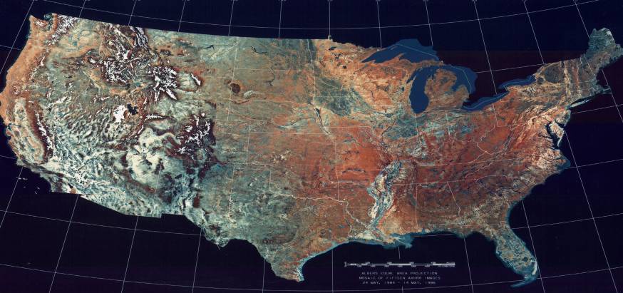 | The next map shows how land cover varies across the US from AVHRR data. Reds are vegetation. Notice the distinct correlation of landform with cancer incidence. But the last cancer incidence image does not correlate so directly with urbanization, shown in the light pollution. | |||